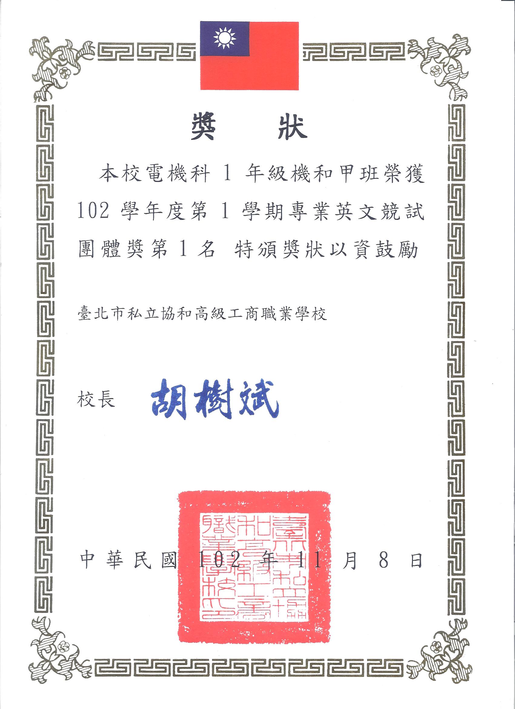 獎狀102上專業英文競試