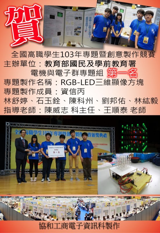 由教育部國民及學前教育署主辦之「全國高職學生103年度專題暨創意製作競賽(以下簡稱本競賽)」決賽暨成果展即將於本(103)年5月9日及5月10日假國立臺灣師範大學舉行。